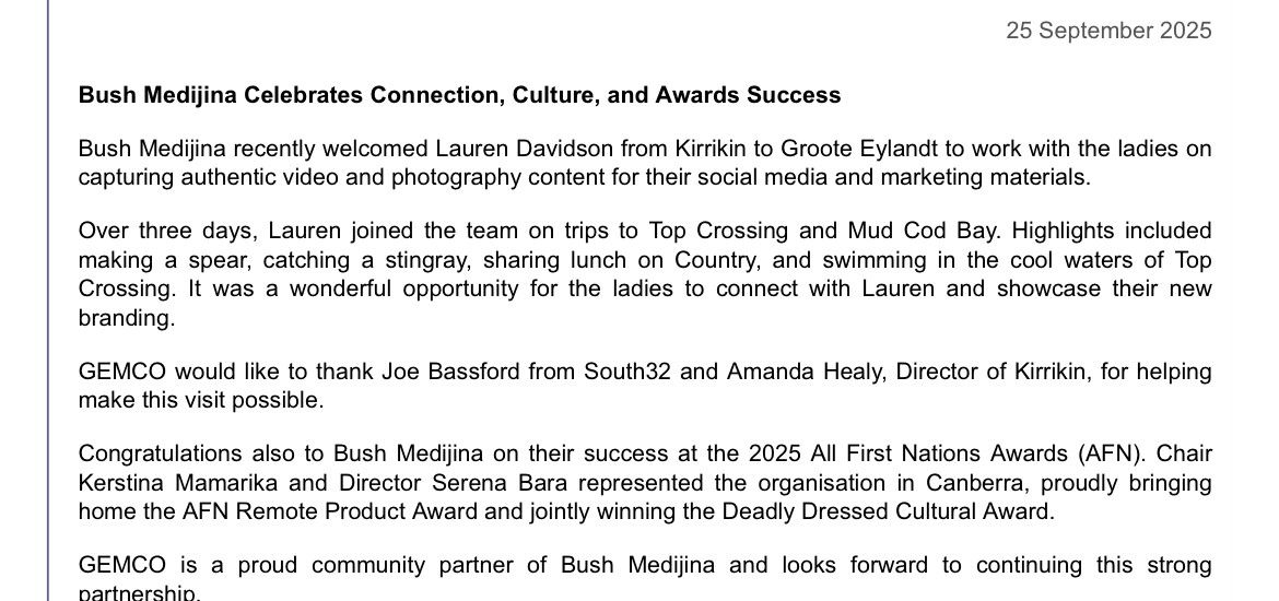 Strong partnerships like this one allow us to amplify Indigenous voices and celebrate the beauty of First Nations culture. I’m grateful to Amanda Healy, Director of Kirrikin, for making the connection, and to the Bush Medijina team for trusting me with their stories. Together, we’re building a future rooted in culture and collaboration.